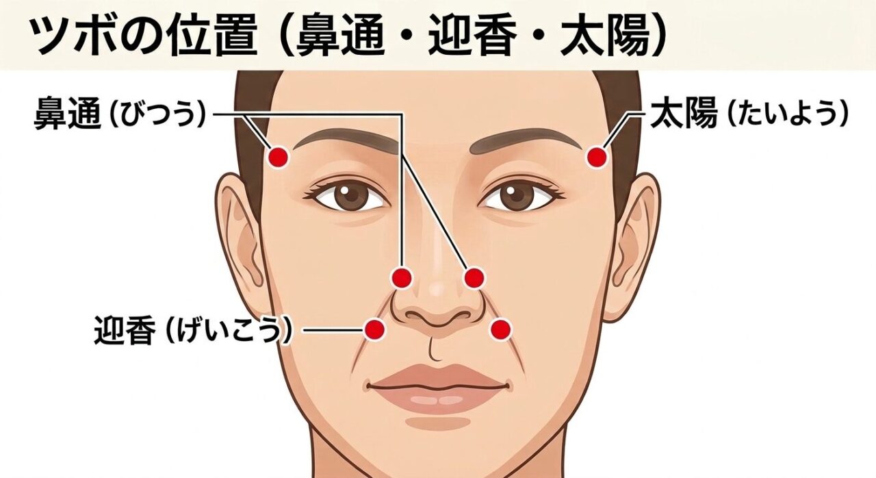 指で少し強めに20〜30秒ほど押すことで、鼻が通ったり、目の痒みがおさまります。